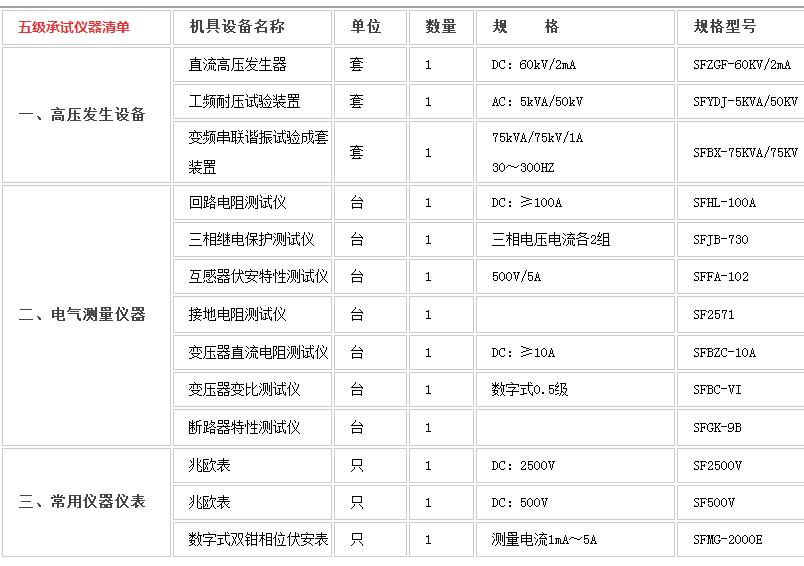 五級承裝承修承試資質(zhì)設(shè)備選型清單
